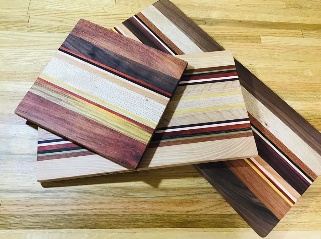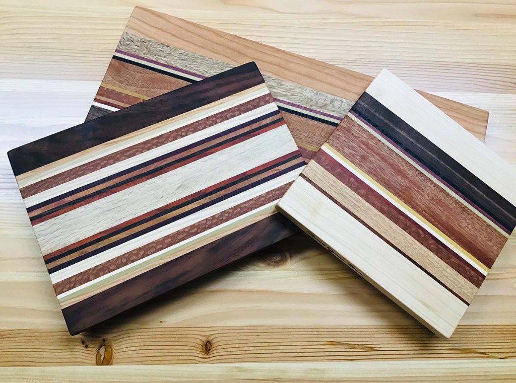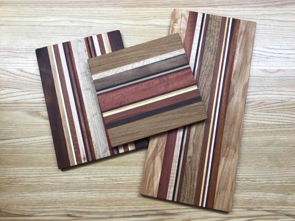 Russell Ooms cutting and serving boards are one-of-a-kind. Each board features sections of multiple wood species arranged in complementary striped patterns and bear the Russell James Ooms signature brand. Woods include walnut, oak, cherry, poplar, mahogany, douglas fir, wenge, hard maple, purple heart, paduke and other exotic and reclaimed woods.