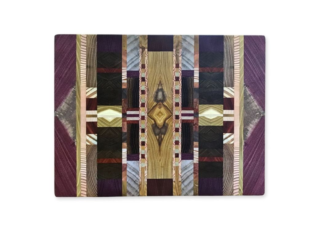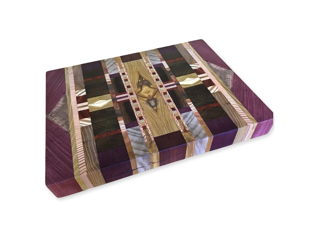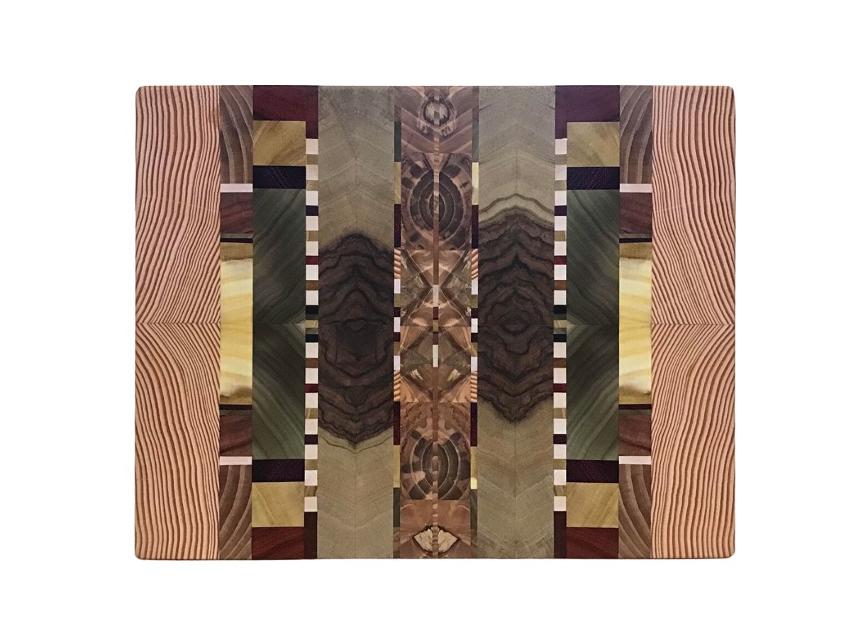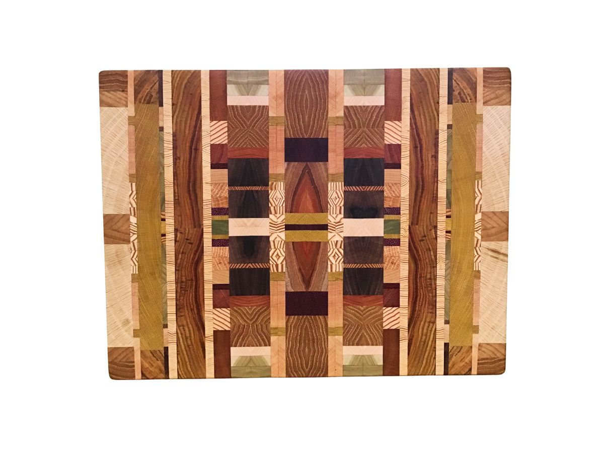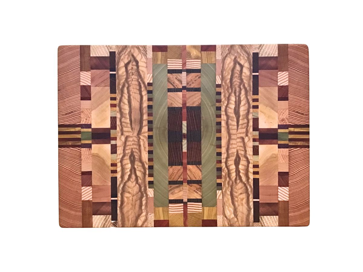 These unique cutting and serving boards are one of a kind. Each features end-grain sections of multiple wood species that are carefully bookmatched and arrayed to create stunning patterns.