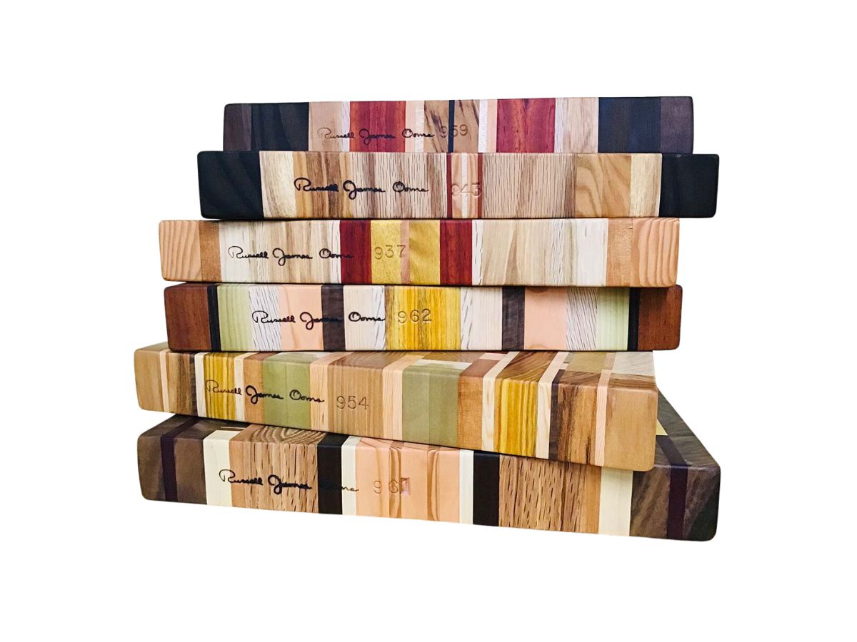 Made in the heart of California’s Delta region, these boards are lovingly crafted and treated with a special mixture of oil and beeswax. Russell uses a variety of woods including Walnut, Oak, Cherry, Poplar, Mahogany, Douglas Fir, Wenge, Hard Maple, Purple Heart, Paduke and other woods that cross his path revealing an interesting end grain patterns. Each board is branded with its distinctive signature, numbered and is a functional work of art.